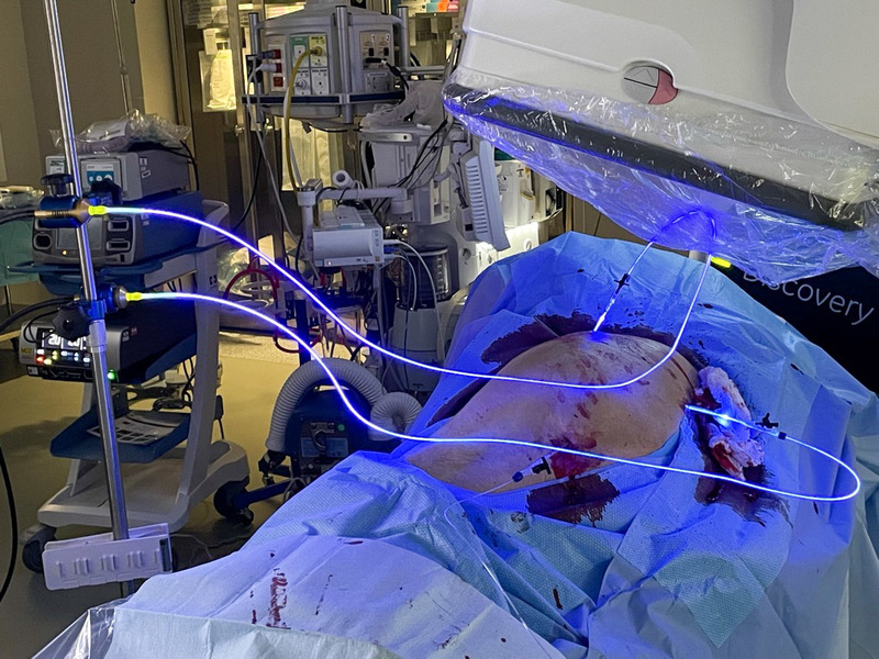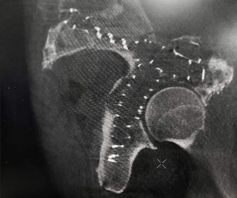 The 63-year-old patient presented with a pathologic acetabulum/hemi-pelvic fracture, and osteolysis with uncontained defect from metastatic lung cancer and additional co-morbidities. The patient has been treated with radiation for metastatic bone disease of the pelvis, and was bed ridden living in a skilled nursing facility due to severe pain and dysfunction resulting from his pathologic pelvis fractures. The patient was brought to surgery and IlluminOss implants were inserted percutaneously through the posterior column, anterior column and LC2 to provide fill and stability for the uncontained osteolytic defect. The implants were filled with a photodynamic liquid monomer and cured with visible blue light. At post-op day 1, the patient was weight bearing as tolerated using a walker. The patient was discharged back to the SNF on post operative day 1 and then from the SNF to home at 2 weeks post procedure. At 6 weeks follow up, patient uses the walker in the community and ambulates unassisted intermittently at home.