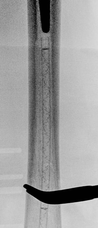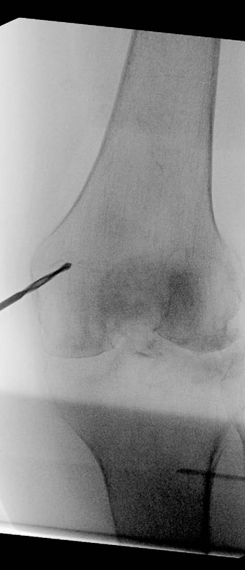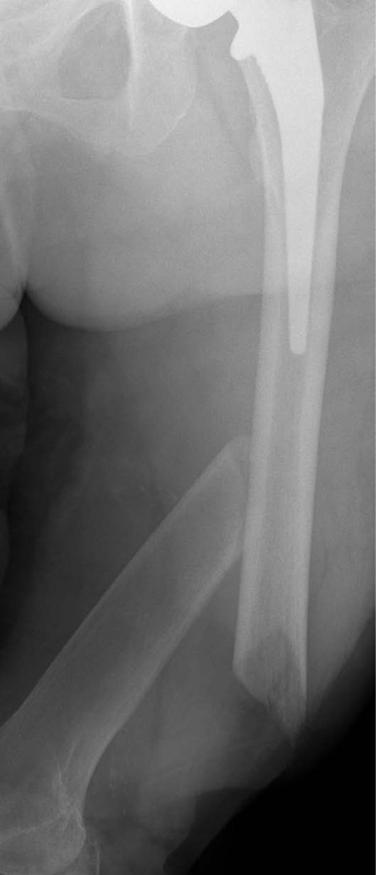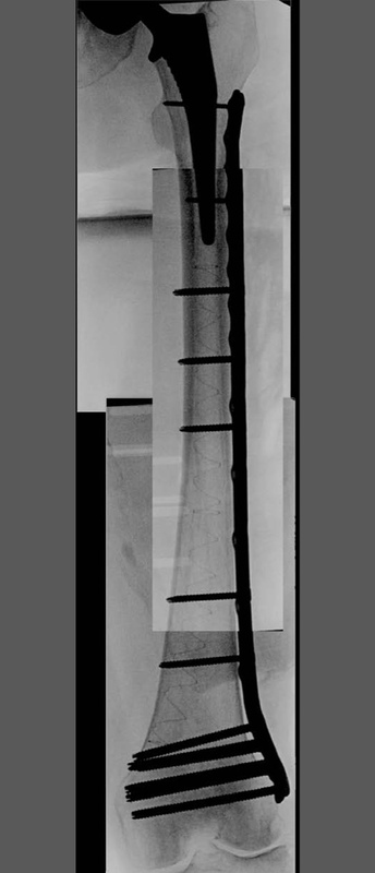 A 90-year-old patient presented with a periprosthetic femur fracture after a fall from a standing height fall. Patient is a community ambulator with no assistive walking device. X-rays revealed a long stem hip implant from a previous hemiarthroplasty. The fracture necessitated fixation and was treated operatively through a small incision in the medial distal femur. The guide wire was inserted to the tip of the stem before the implant was inserted. The IlluminOss implant was inserted, filled with liquid monomer, and cured with visible light. A plate and screw construct was placed laterally with screws extending into the hardened IlluminOss implant for support. Patient was allowed to weight bear as tolerated and reported no issues at follow up visit.