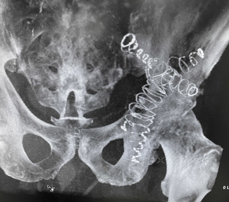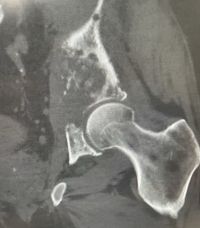 The 63-year-old patient presented with a pathologic acetabulum/hemi-pelvic fracture, and osteolysis with uncontained defect from metastatic lung cancer and additional co-morbidities. The patient has been treated with radiation for metastatic bone disease of the pelvis, and was bed ridden living in a skilled nursing facility due to severe pain and dysfunction resulting from his pathologic pelvis fractures. The patient was brought to surgery and IlluminOss implants were inserted percutaneously through the posterior column, anterior column and LC2 to provide fill and stability for the uncontained osteolytic defect. The implants were filled with a photodynamic liquid monomer and cured with visible blue light. At post-op day 1, the patient was weight bearing as tolerated using a walker. The patient was discharged back to the SNF on post operative day 1 and then from the SNF to home at 2 weeks post procedure. At 6 weeks follow up, patient uses the walker in the community and ambulates unassisted intermittently at home.